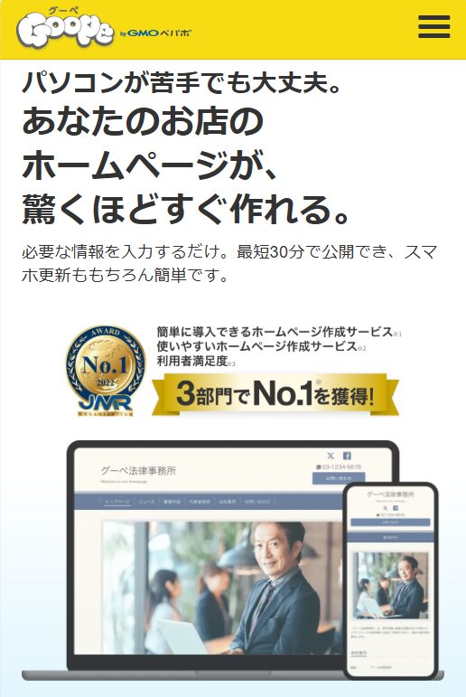| Goope(グーペ) | 店舗サイトやサービスサイト向け機能が用意されている | 店舗サイト / 小規模サイト | 約40種類(変動あり) | 1,210円~ | 独自ドメイン / 予約・EC機能(プランによる) |