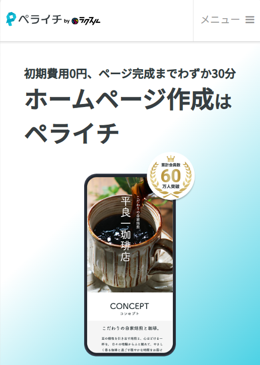 | ペライチ | 1ページ構成のサイト作成に対応した設計 | サービス紹介 / イベントページ | 複数テンプレートあり | 0円~(※公開は有料プランの場合あり) | スマホ対応 / 予約・決済機能あり(プランによる) |